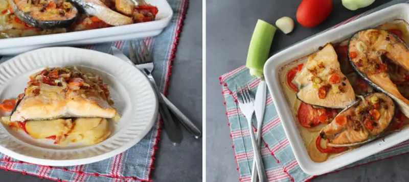 This recipe for baked salmon with potatoes and vegetables is great for a light dinner. The salmon is very juicy and the potatoes collect all the flavor of the other ingredients, perfect for eating with the family.