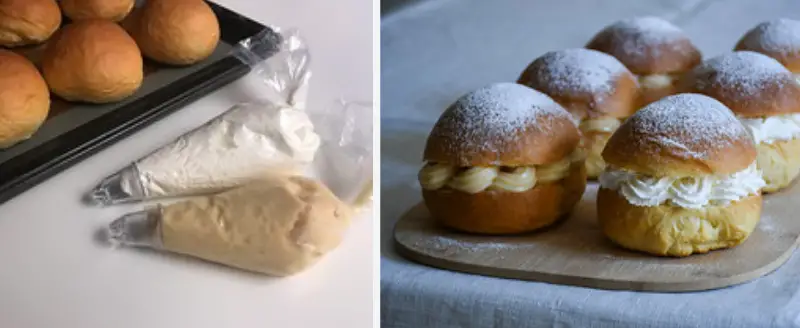 When the Cristinas are cold we make a cross section and fill with pastry cream or whipped cream , using a pastry bag for each type of filling. Sprinkle with icing sugar and ready to serve.
