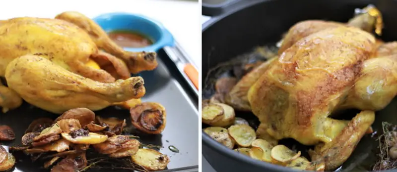 - We water both the chicken and the potatoes with the remaining thyme oil.