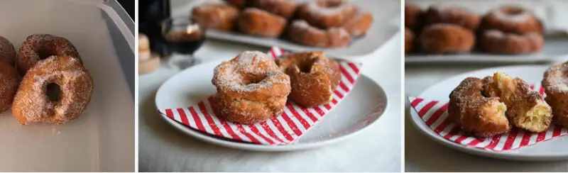 - When the donuts are golden, drain them well of oil, remove to a plate with sugar and coat well. Let cool before serving.