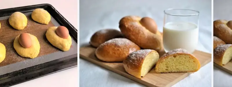 - When the monkeys are ready we paint them again with milk or a mixture of milk and egg yolk, sprinkle with sugar and place hard-boiled eggs in the center of the surface. We can also choose to bake them without eggs.