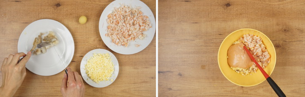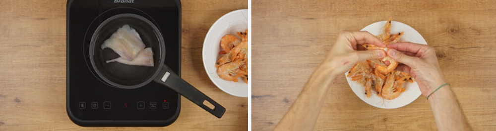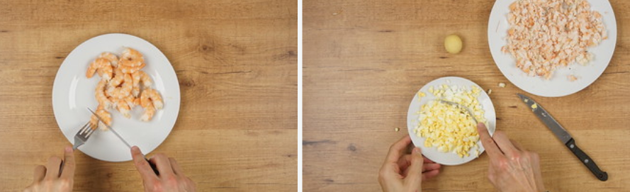 - We take the prawns and remove the head and shell. We transfer them to a plate and with the help of a fork and a knife we cut them into very small portions. When the monkfish has cooled, we do the same with it: using the knife and fork we remove the bones and any remains of skin if there are any and we shred the fish.