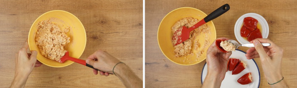 - To make it simple, we take the peppers as if they were an ice cream cone, making a space between our fingers, and each time we add a spoonful we press the mixture towards the bottom carefully, this way we get a perfect shape and that they do not fall apart when we place them in the plate.