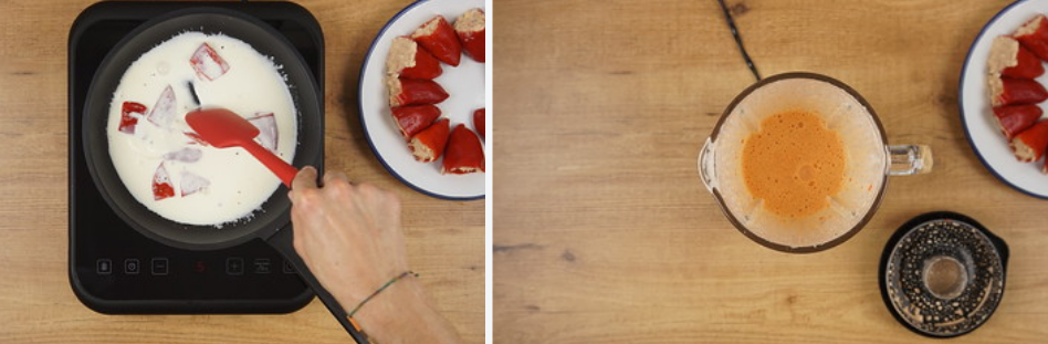- We chop the peppers that we had set aside and pour them over the cream. Add salt and pepper, stir and let it heat without boiling for a couple of minutes. We transfer the cream with the peppers to a blender and blend it until it has a uniform orange texture.
