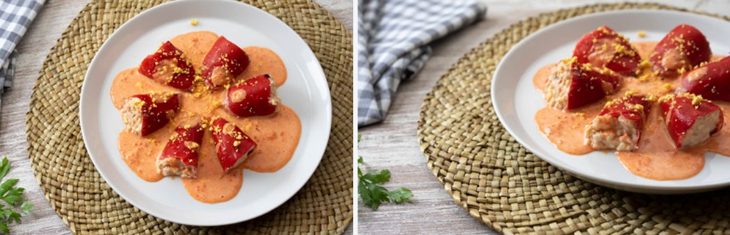 - We place the peppers on a platter, making a wheel and with the filling facing out. We cover with a few tablespoons of sauce (if it is too loose we can add some more piquillo pepper before removing it from the blender) and sprinkle with the yolk that we had reserved, once chopped.