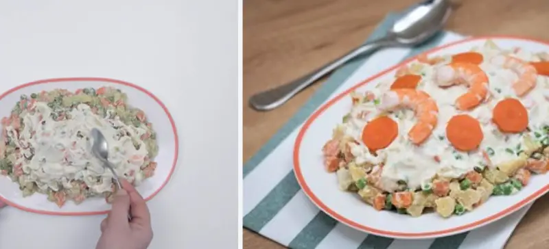 - We pass the mixture to a source, we cover it with the rest of the mayonnaise using a spoon or a spatula.