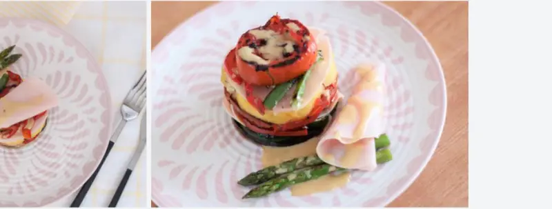 Preparation and final assembly of the timbale of roasted vegetables with turkey